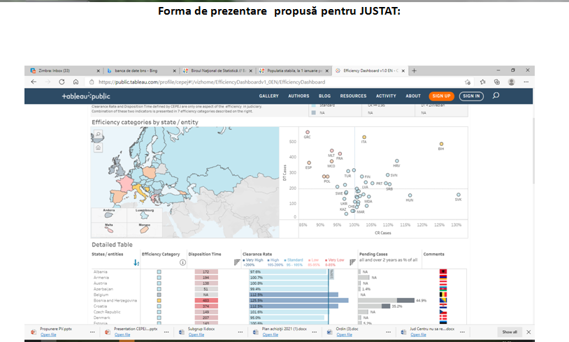 Reamintim că scopul acestui exercițiu propus de CEPEJ constă în afișarea pentru accesibilitatea publicului larg a unui set mai larg de date privind performanța activității sistemului judecătoresc din Republica Moldova, în formă mult mai simplu de perceput, după modelul instrumentului CEPEJ STAT.