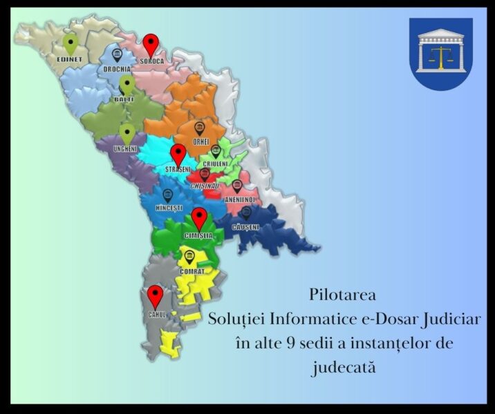 Astfel, la momentul actual, aplicația informatică E-dosar judiciar este pilotată în: Judecatoria Orasul Edinet (Edineț, Briceni, Ocnița, Dondușeni); Judecătoria Bălți (Bălți, Fălești, Sângerei), Judecătoria Ungheni și urmează a urmează a fi pilotată încă în:Judecătoria Strășeni (Strășeni, Călărași); Judecătoria Soroca (Soroca, Florești); Judecătoria Cahul (Cahul, Cantemir, Taraclia); Judecatoria Cimislia (Cimișlia, Leova).